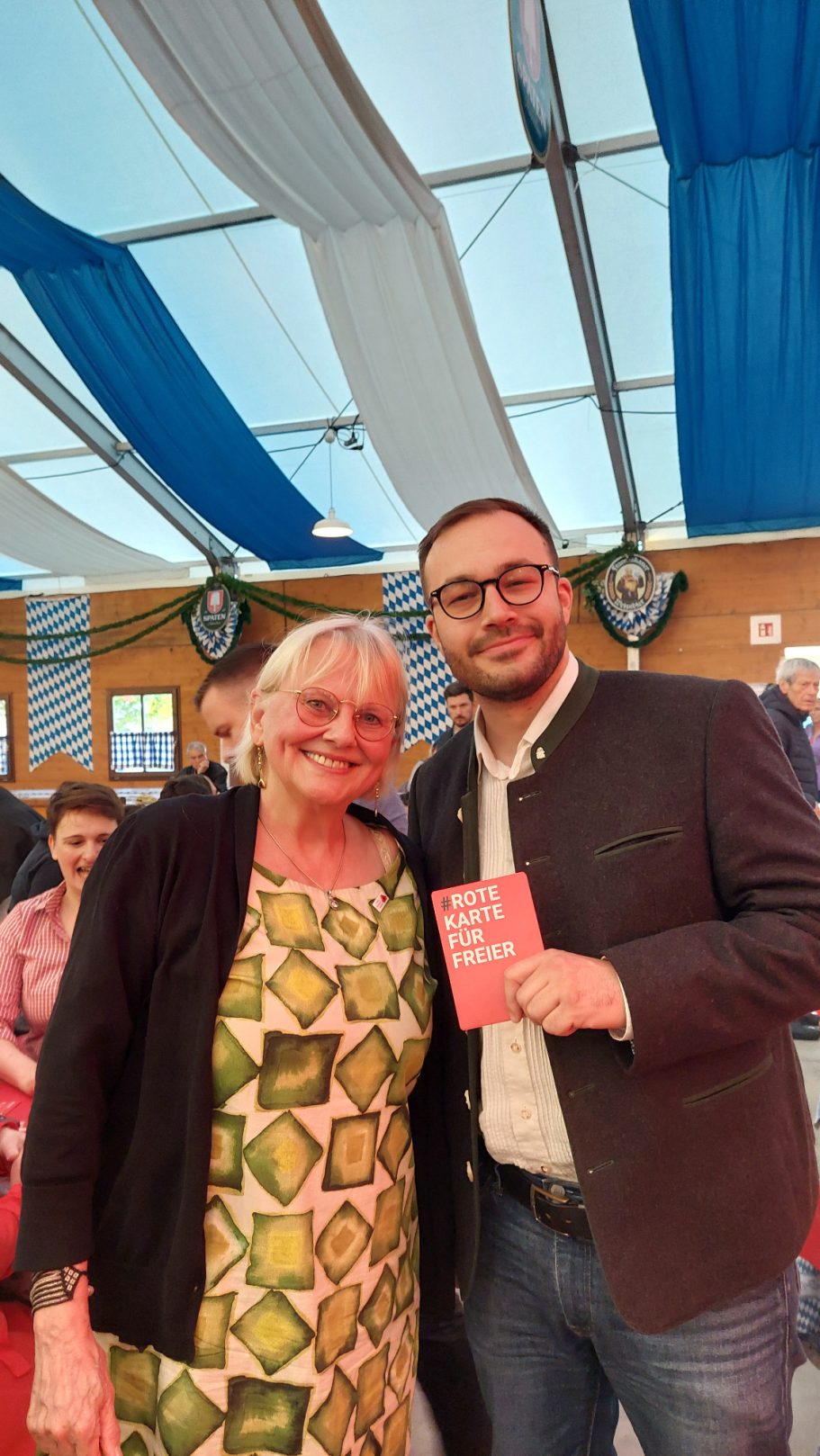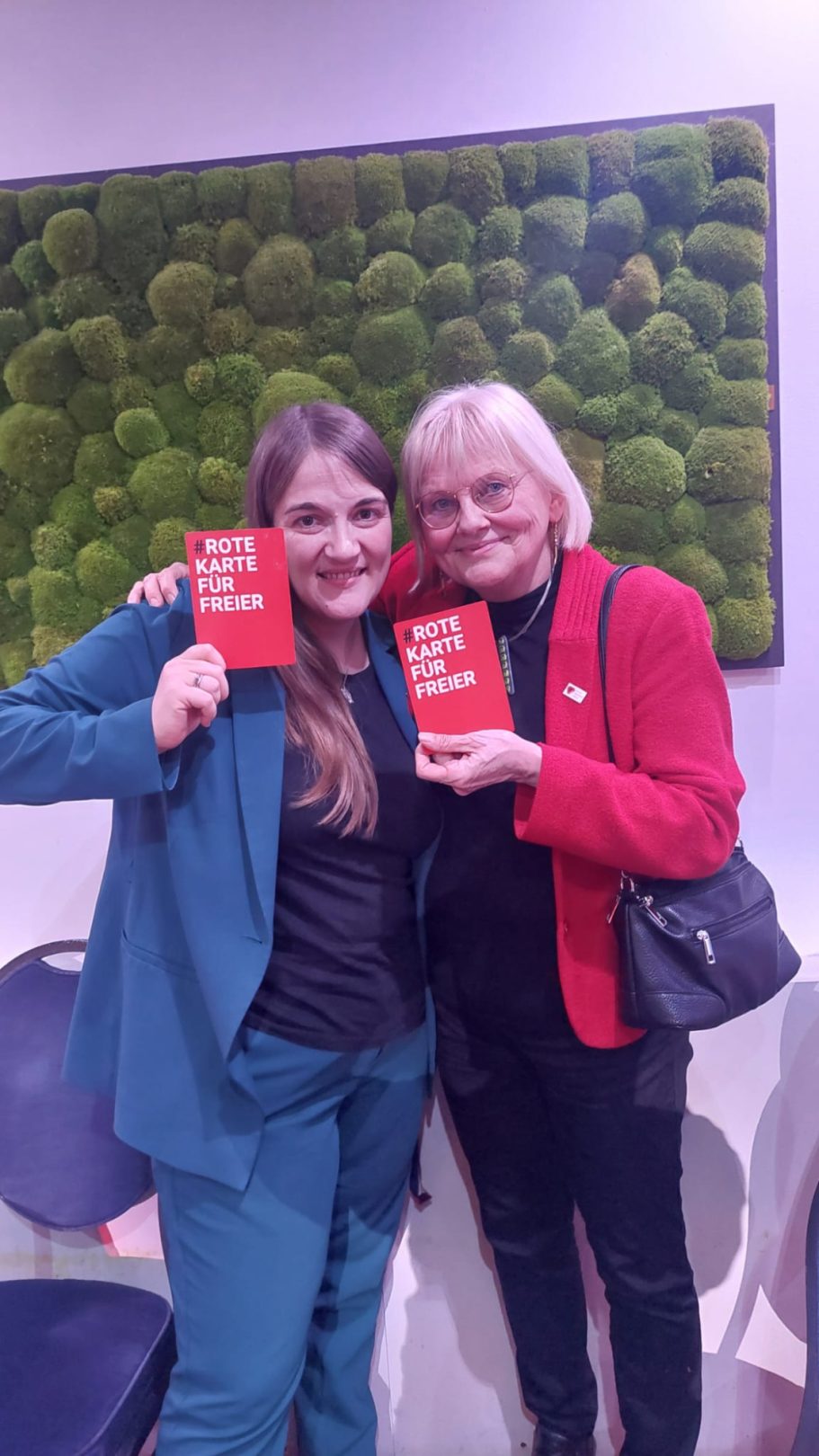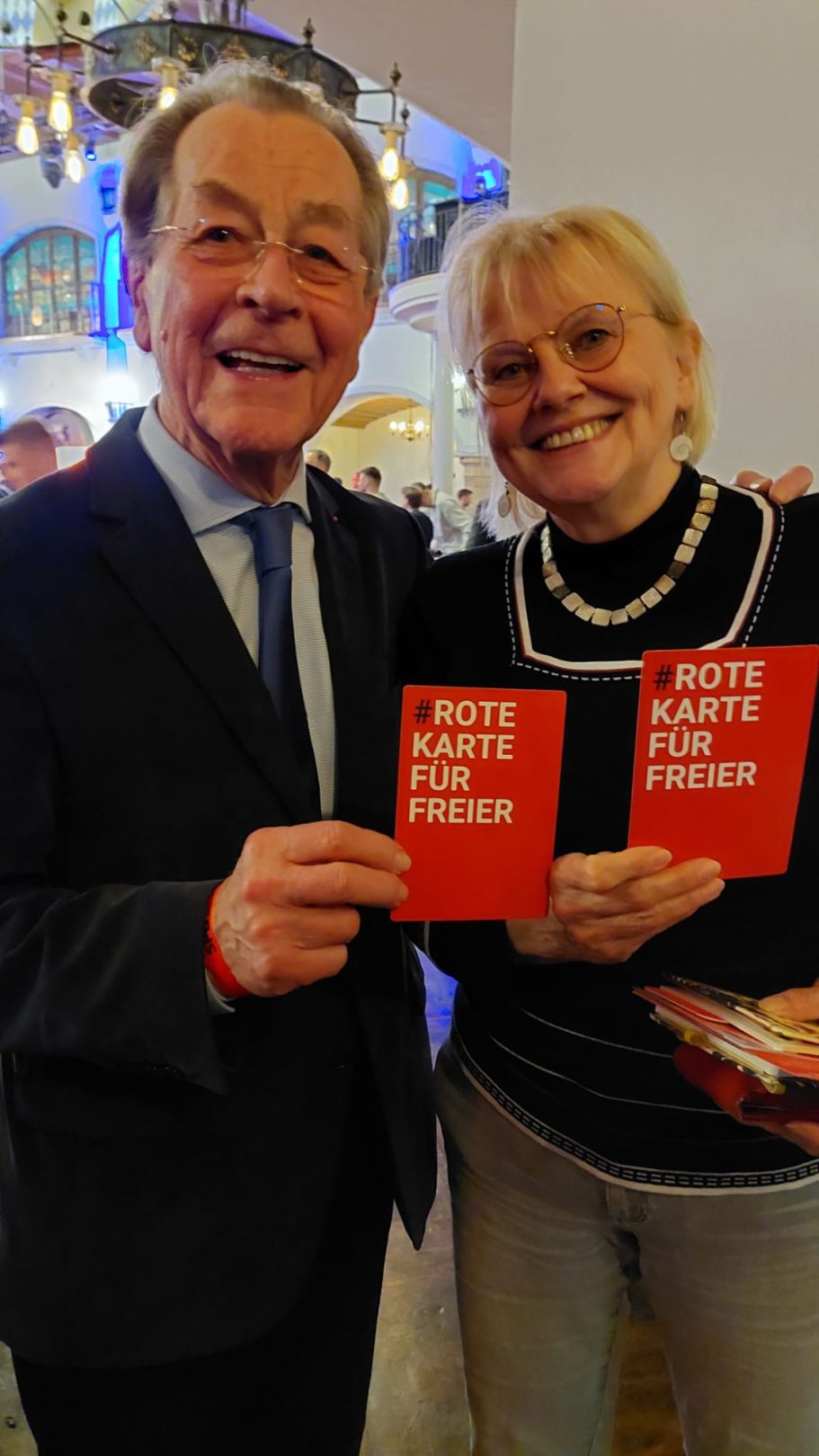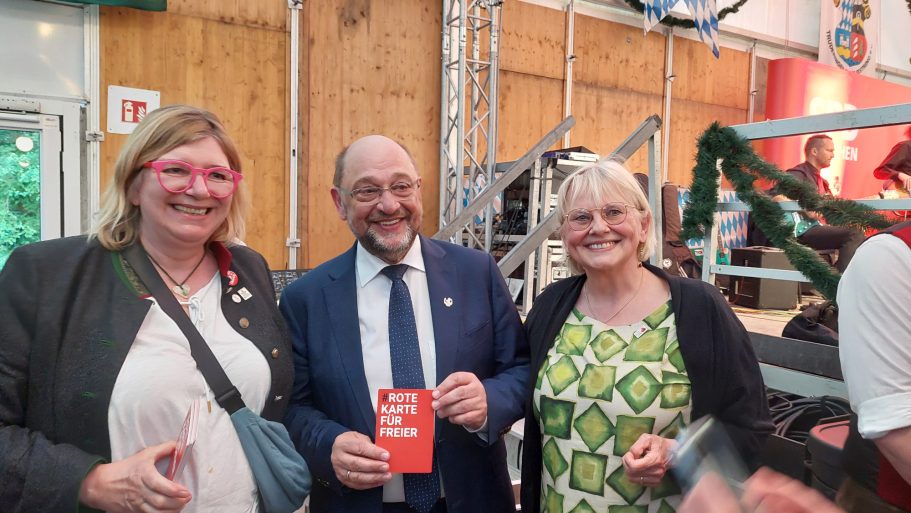 Alice Schwarzer, aus dem bayerischen Landtag Freie Wähler: Susanne Enders, Roswitha Toso, Ulrike Müller, MdL Barbara Fuchs von den Grünen sowie Renate Unterberg, Simon Klopstock von der V-Partei³, Dardan Kolic von den Grünen, Mitglied im Bezirkstag, präsentieren ebenfalls stolz die Rote Karte für Freier.
