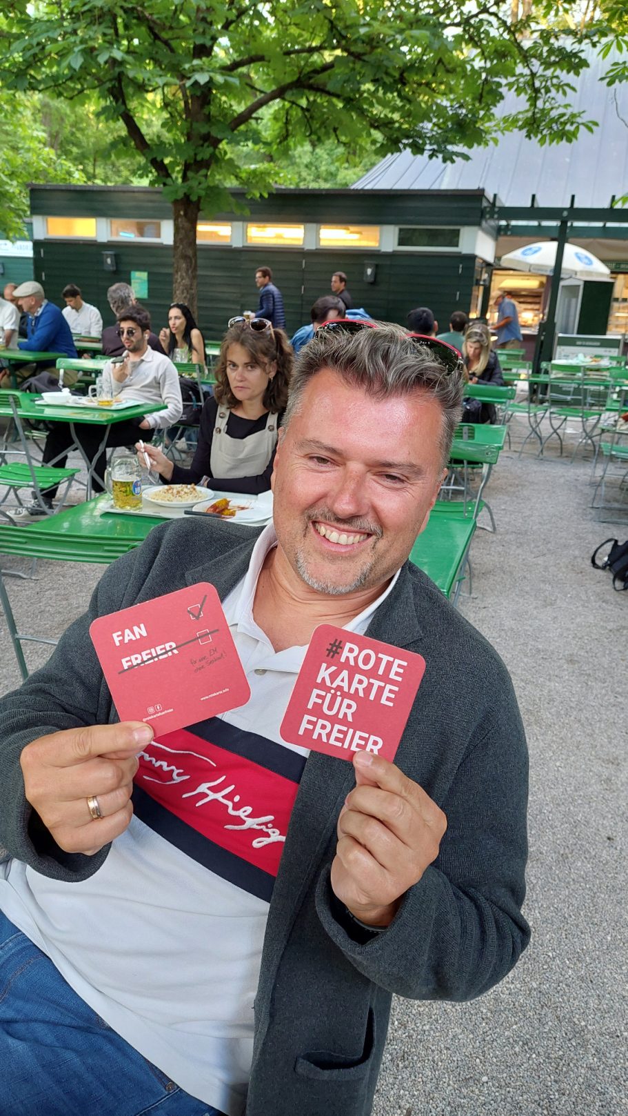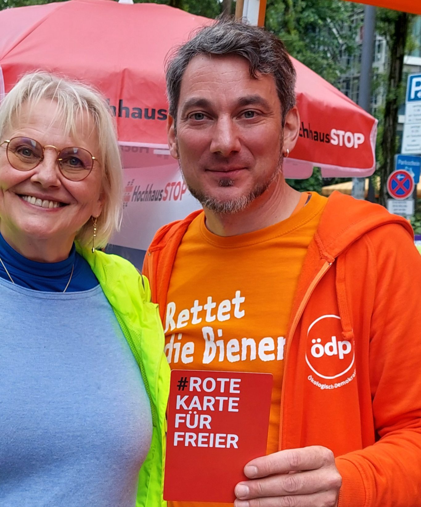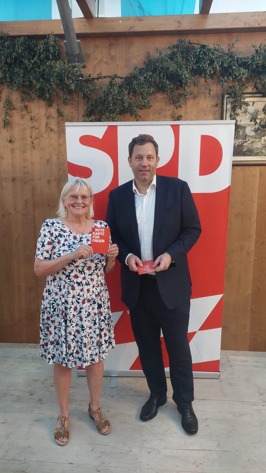 Alice Schwarzer, aus dem bayerischen Landtag Freie Wähler: Susanne Enders, Roswitha Toso, Ulrike Müller, MdL Barbara Fuchs von den Grünen sowie Renate Unterberg, Simon Klopstock von der V-Partei³, Dardan Kolic von den Grünen, Mitglied im Bezirkstag, präsentieren ebenfalls stolz die Rote Karte für Freier.
